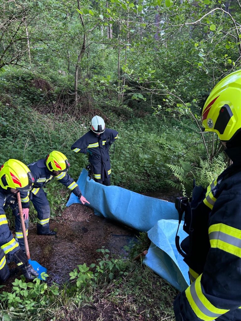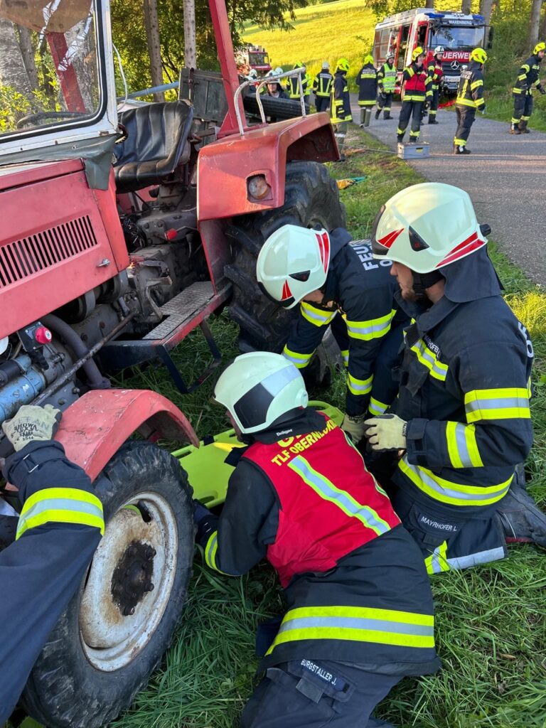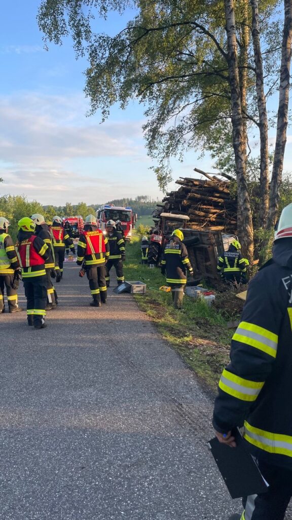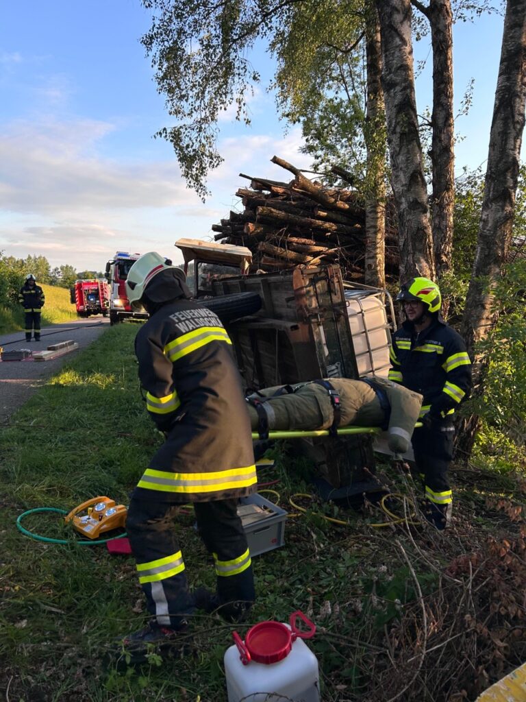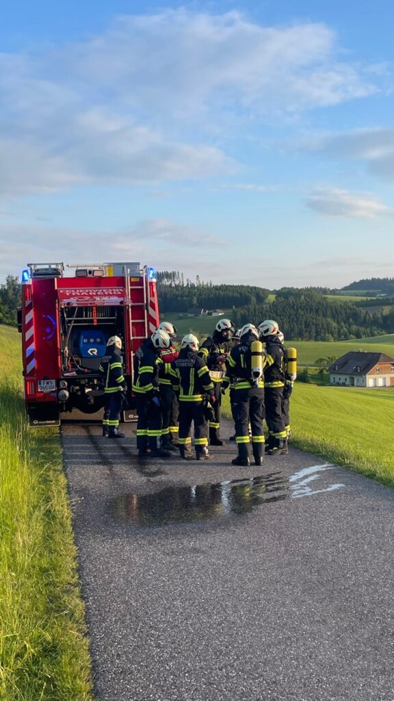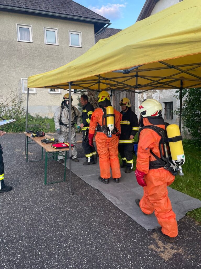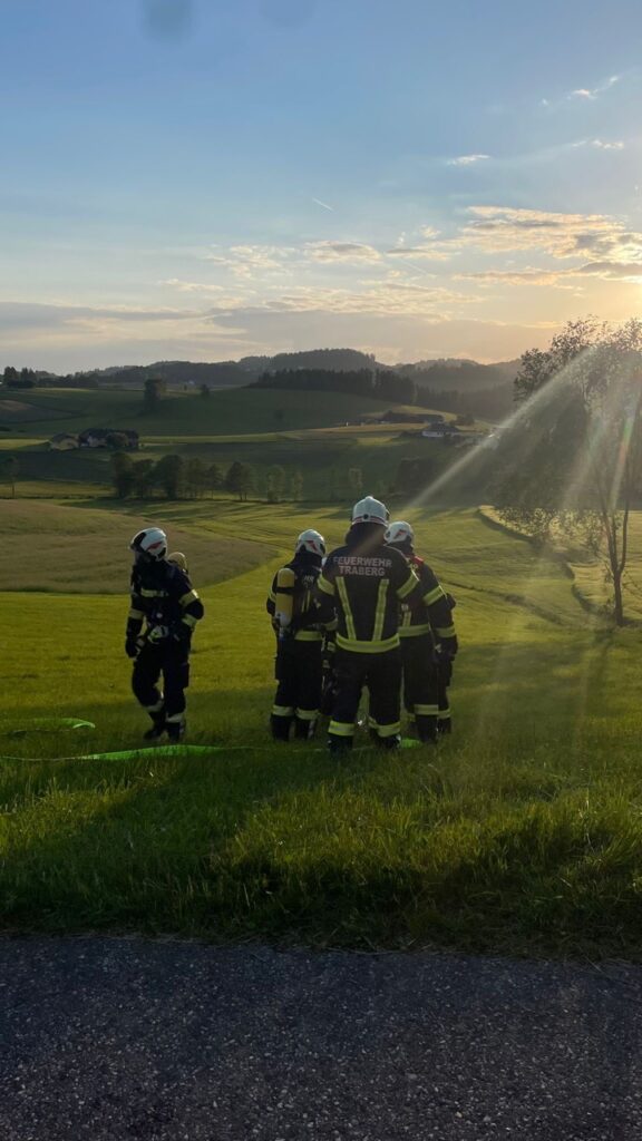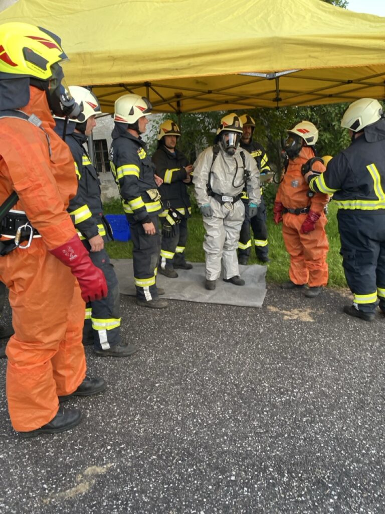 Auch heuer veranstalteten wir wieder eine Pflichbereichsübung für unsere 5 Feuerwehren der Gemeinde. Bei der Übung war das Hauptthema die Technische Hilfeleistung. Annahme war, dass eine Ballenpresse in Brand geraten war. Ein zweiter Bauer wollte mit seinem Traktor Hilfe holen, dabei verlor er die Kontrolle über sein Gespann und überrollte zwei Personen. Auf dem Anhänger, welcher umkippte, hatte er unglücklicherweise einen IBC-Container mit Heizöl und mehrere Kanister Chlor sowie Benzin geladen, welche teilweise ausgelaufen sind. Unter Schutzstufe 2 Anzügen wurden die Behälter gesichert, sodass die eingeklemmten gerettet werden konnten. Parallel dazu konnte vom Tank Traberg der Brand der Ballenpresse bekämpft werden. Das Ölfahrzeug der FF Bad Leonfelden richtete in einem Bach eine Ölsperre ein um eine Schädigung der Umwelt zu verhindern.