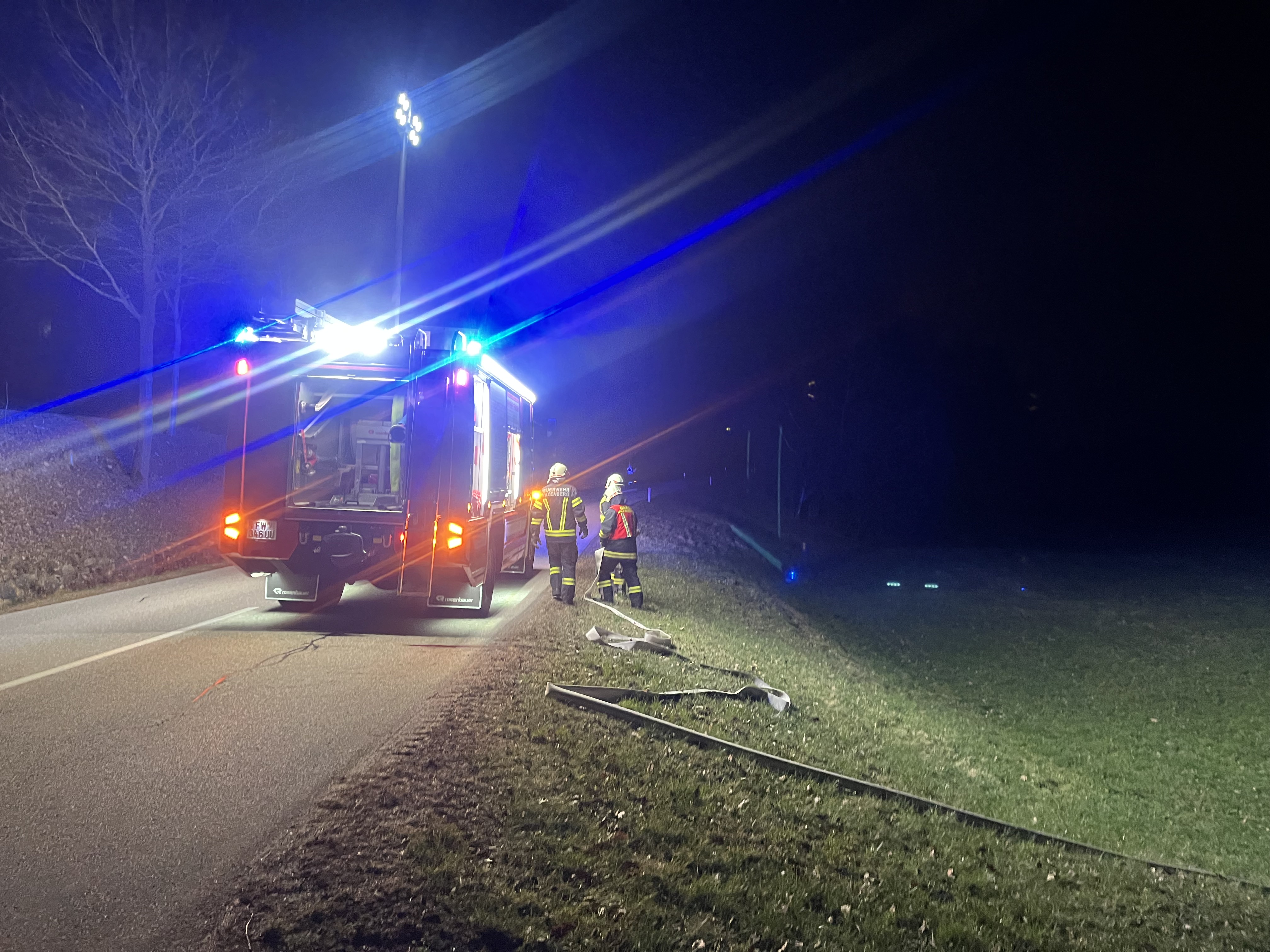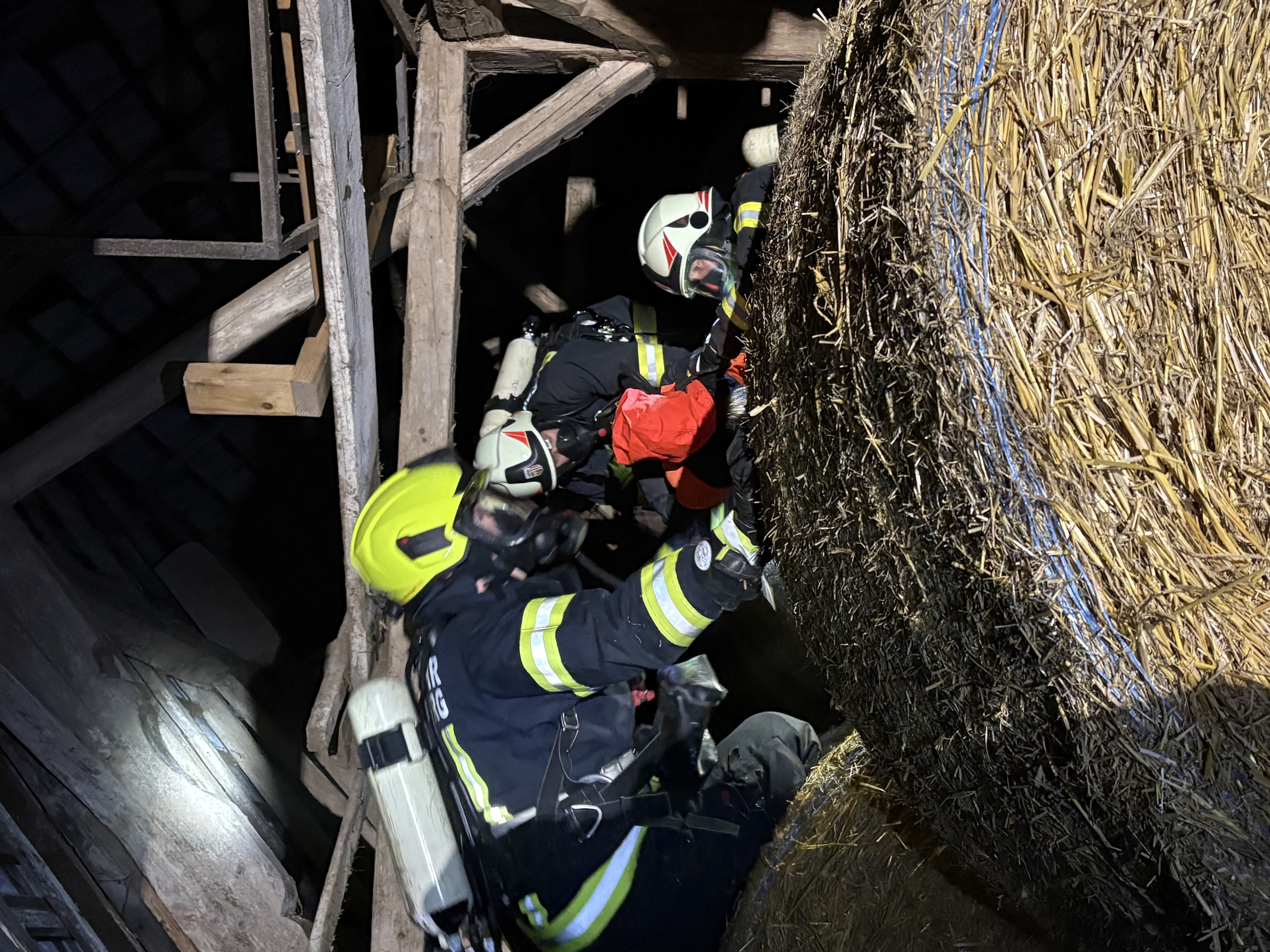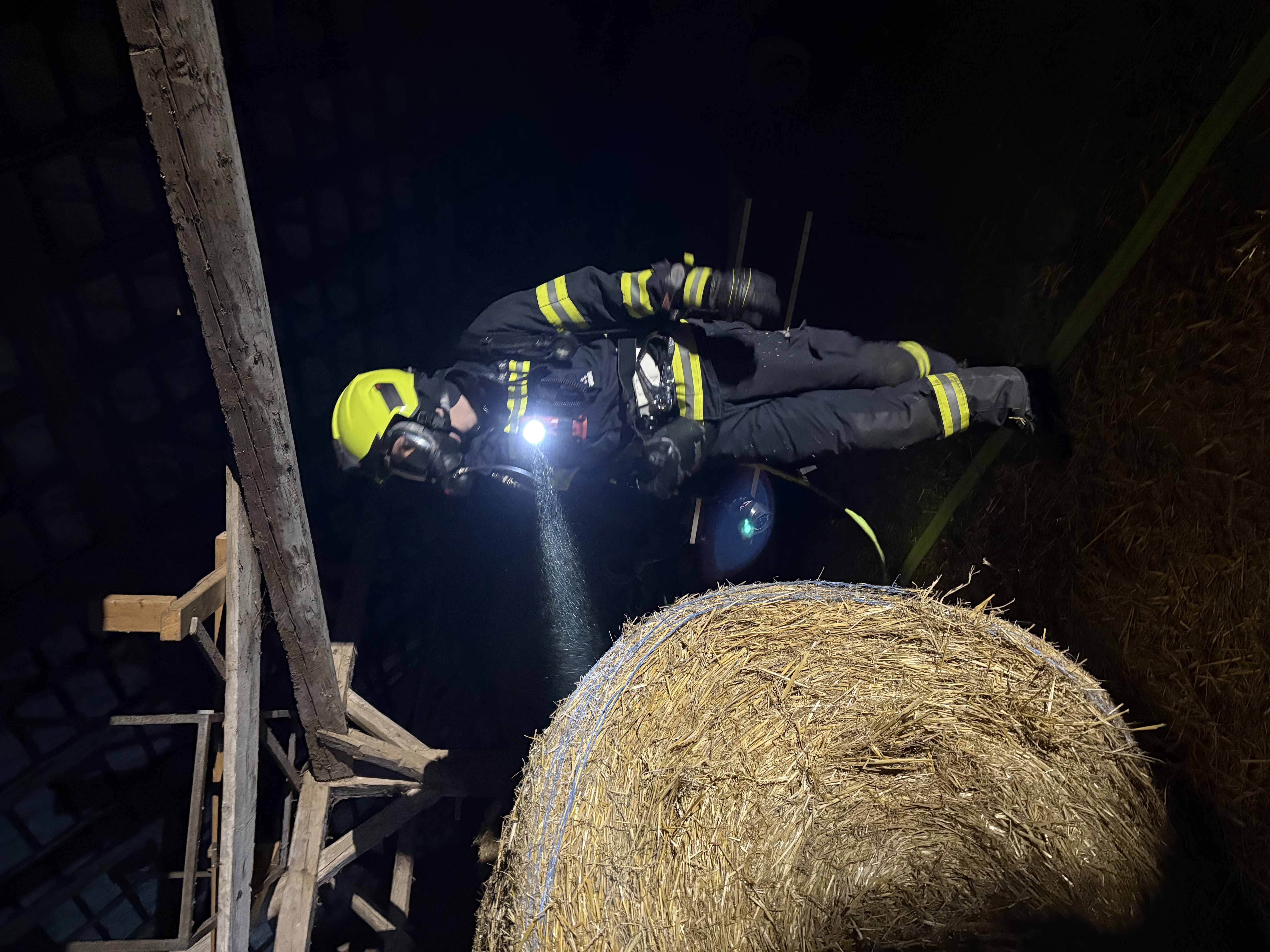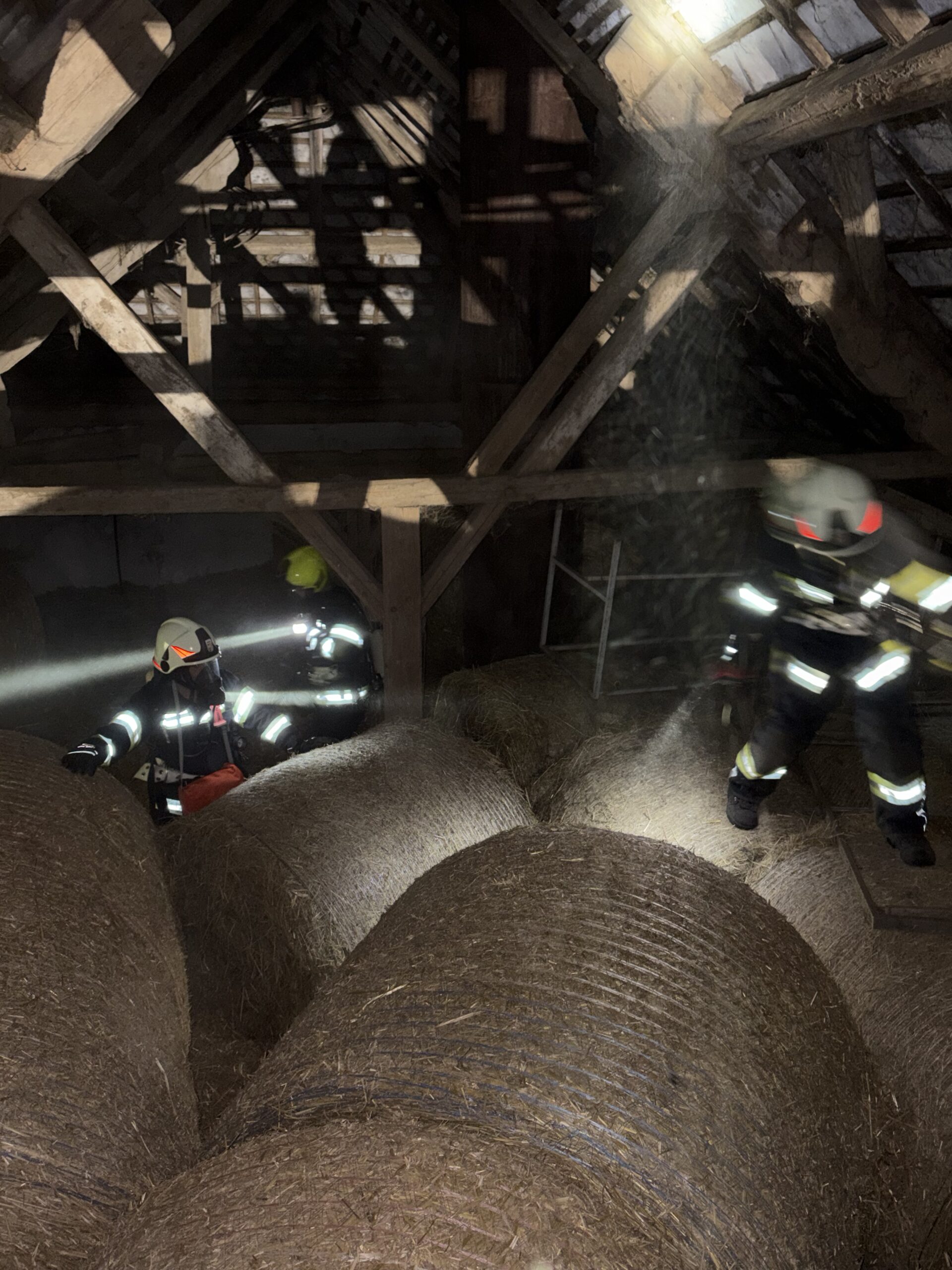 Bei der Ankunft am Übungsort wurden wir vom Hausbesitzer darüber informiert, dass hinter seinem Strohlager Rauch aufstieg. Zusätzlich würden sich noch 3 Personen im betroffenen Bereich aufhalten.
